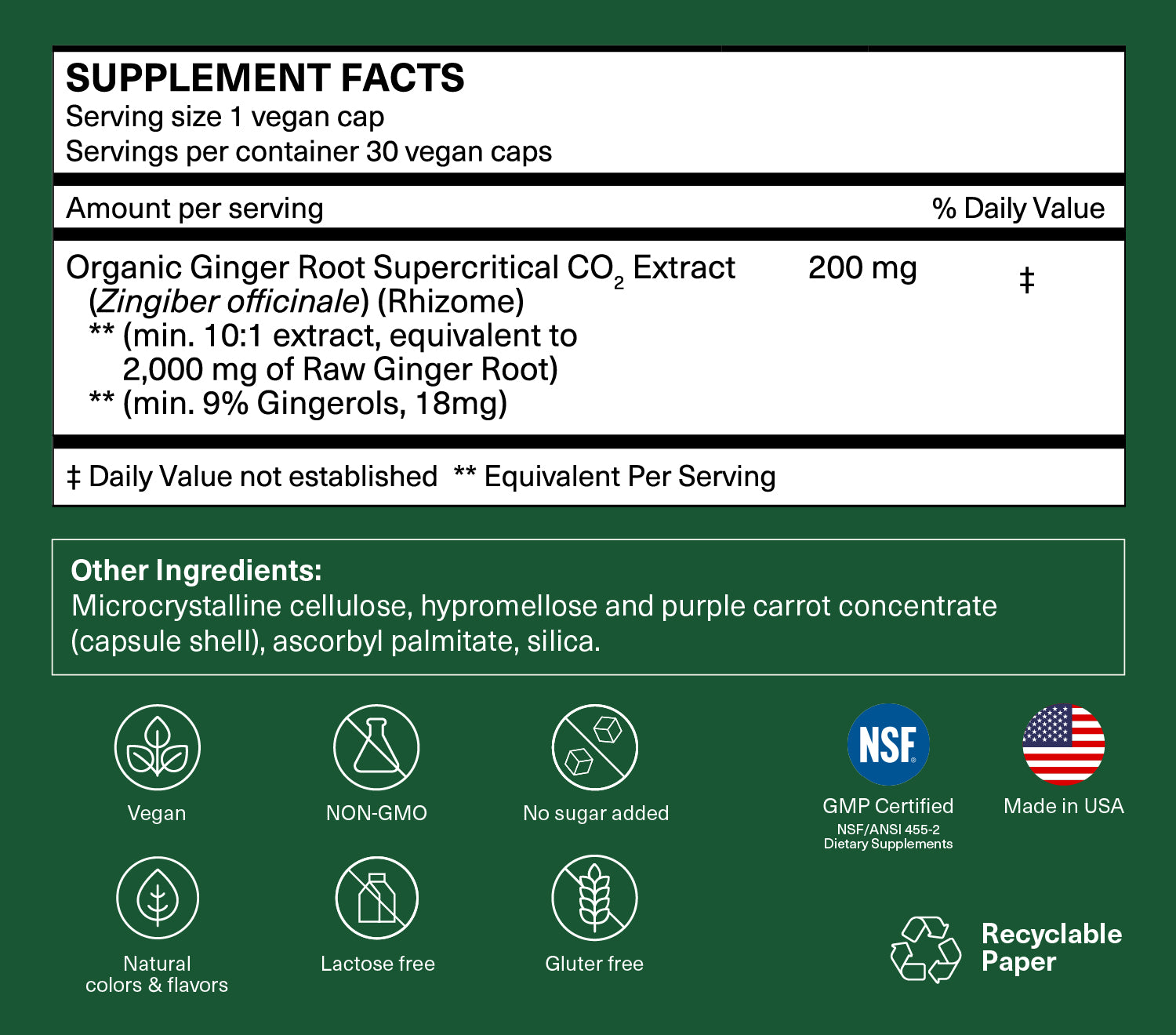 Amount per serving %DRV* Organic Ginger Root Supercritical CO₂ Extract (Zingiber officinale ) (Rhizome)